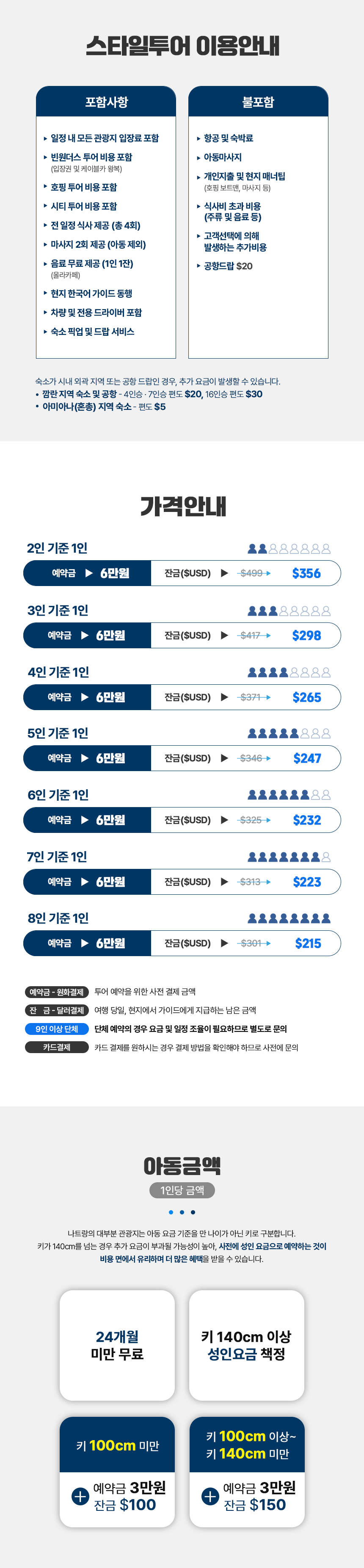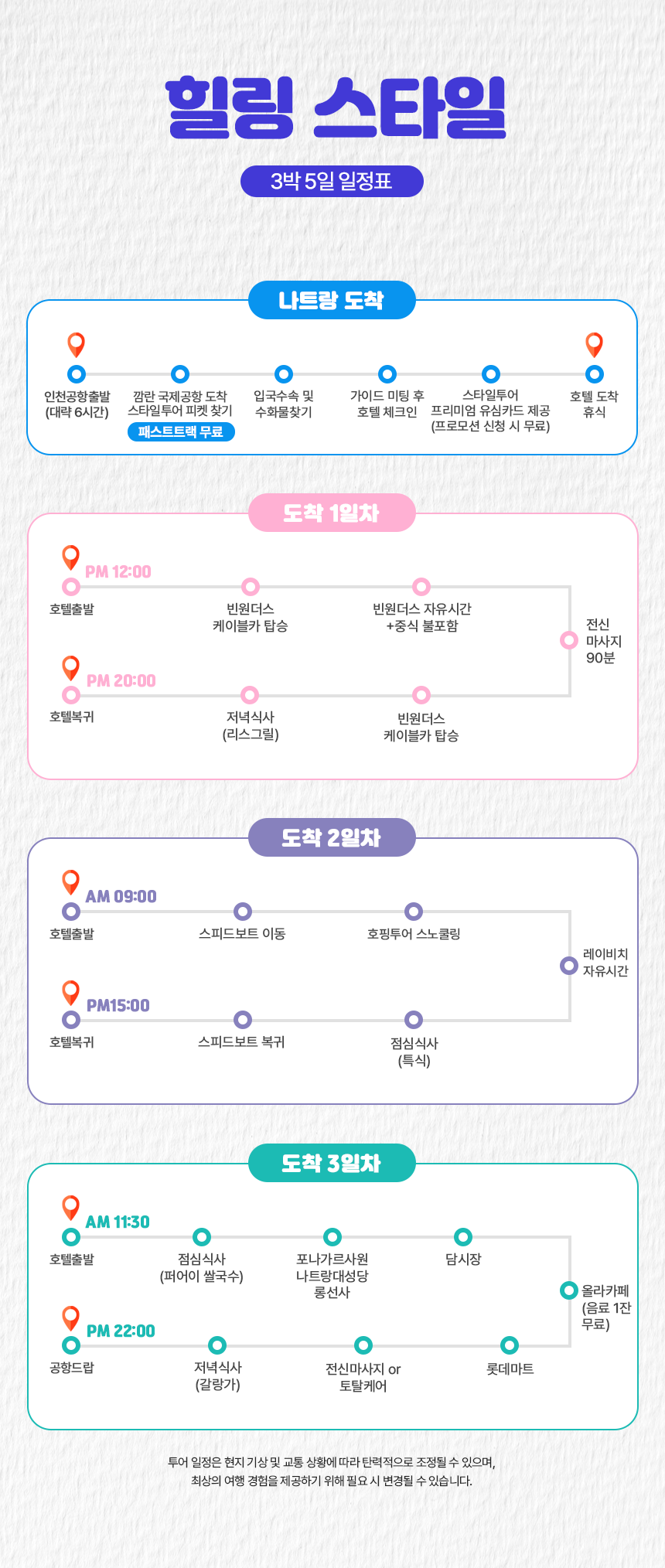 투어일정은 현지 기상 및 교통상황에 따라 탄력적으로 조정될 수 있으며, 최상의 여행 경험을 제공하기 위해 필요 시 변경될 수 있습니다.
