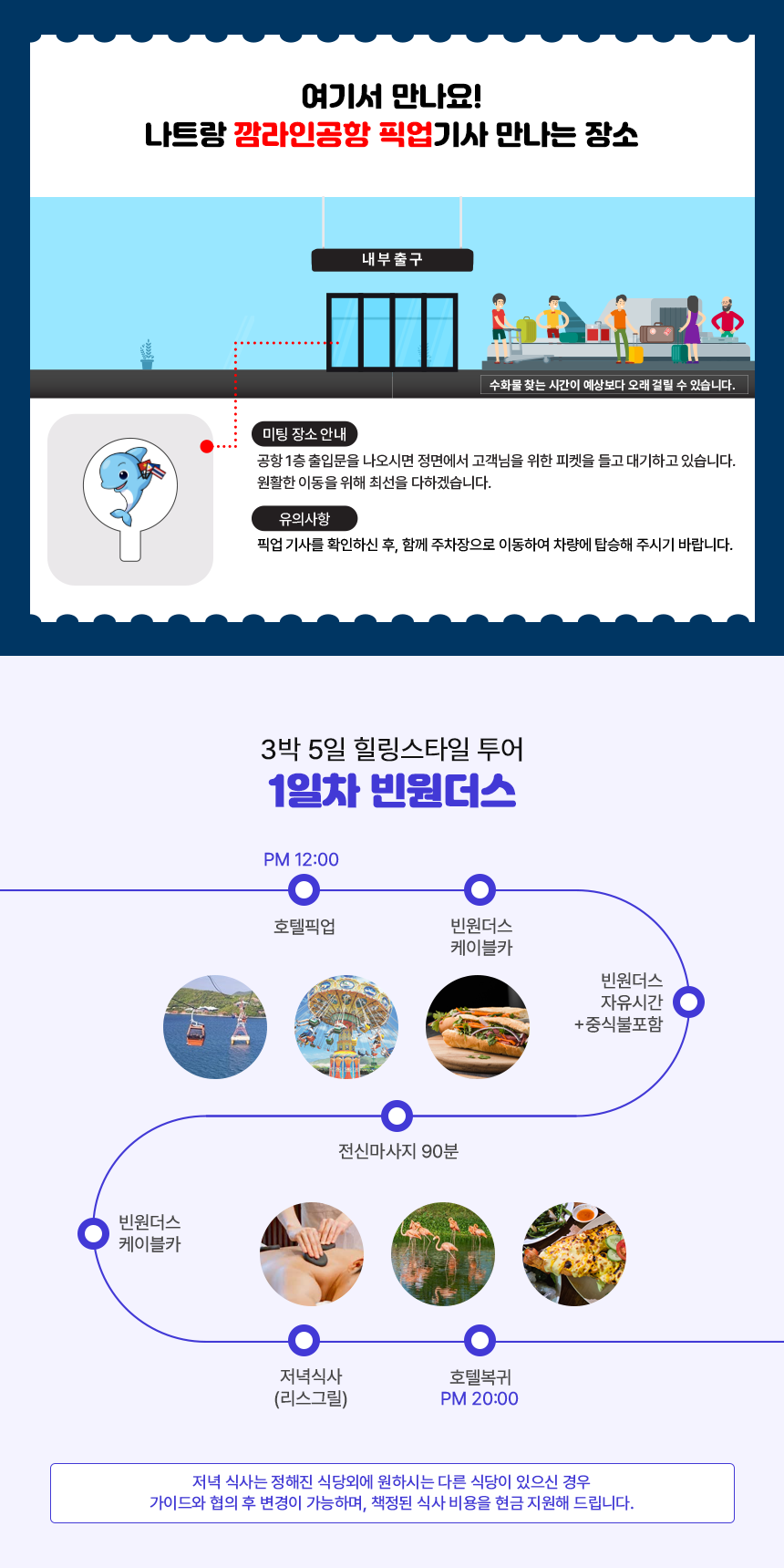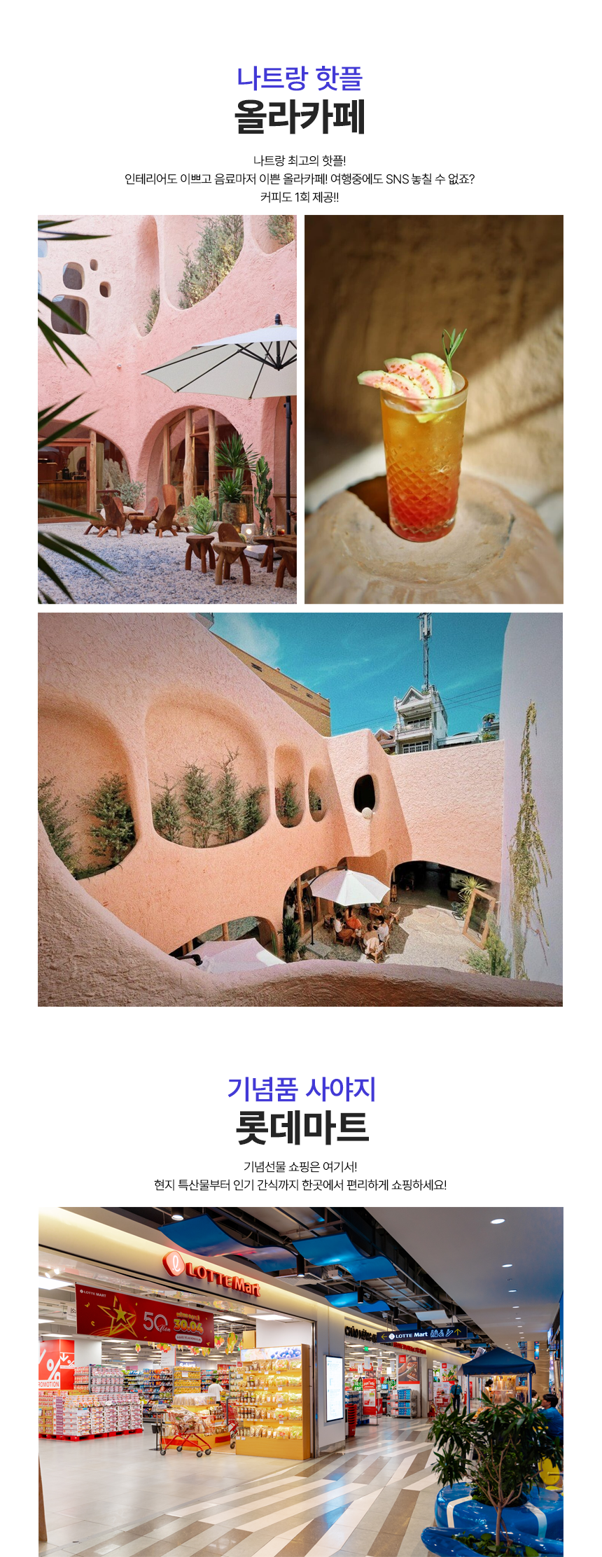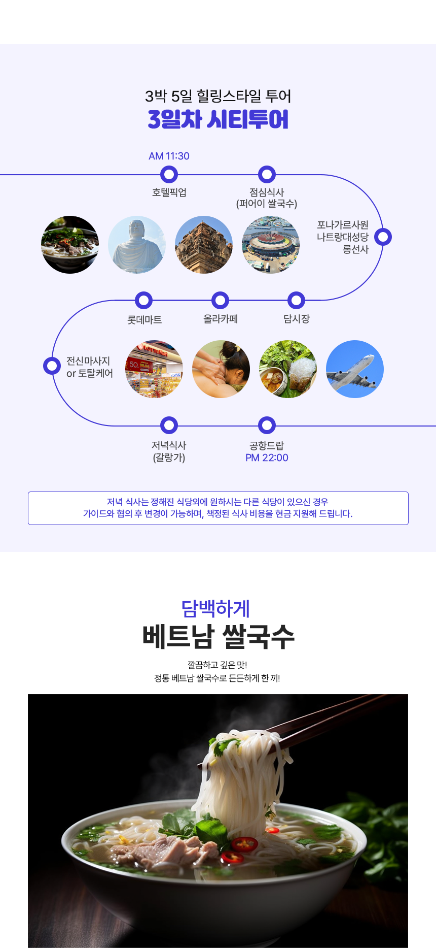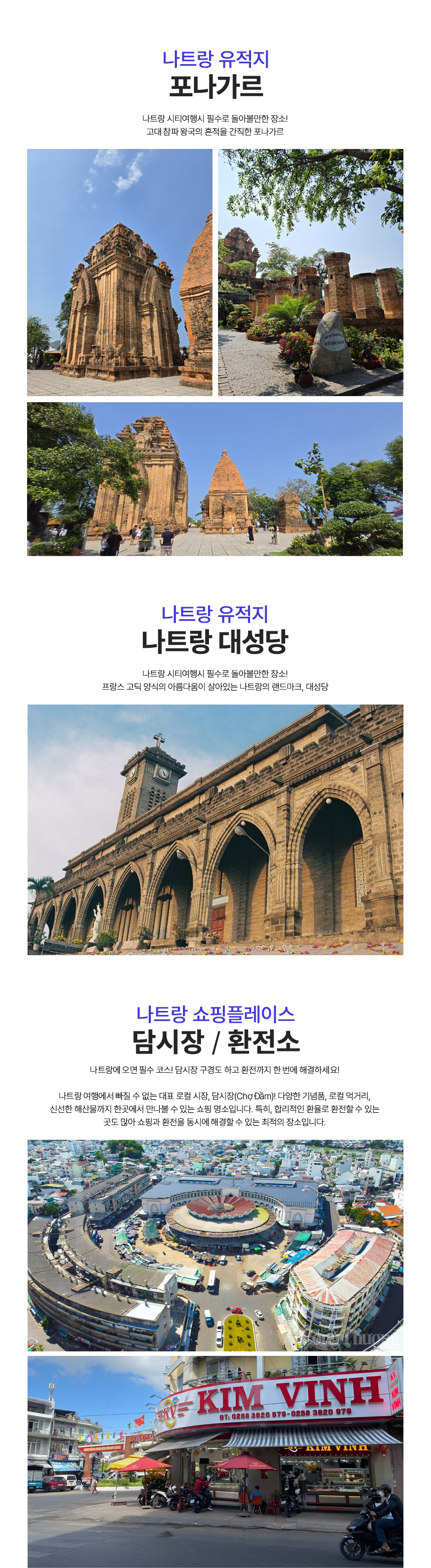 오전 11시 30분 호텔 픽업→ 점심: 퍼어이 쌀국수 → 나트랑 주요 관광지 투어(포나가르 사원, 나트랑 대성당, 롱선사) → 담시장 쇼핑 → 올라카페 방문 (1인 1음료 무료 제공) → 롯데마트 → 전신마사지 or 젠틀맨 토탈케어 中 택 1 → 공항 드랍 (밤 비행기 출국 기준)
