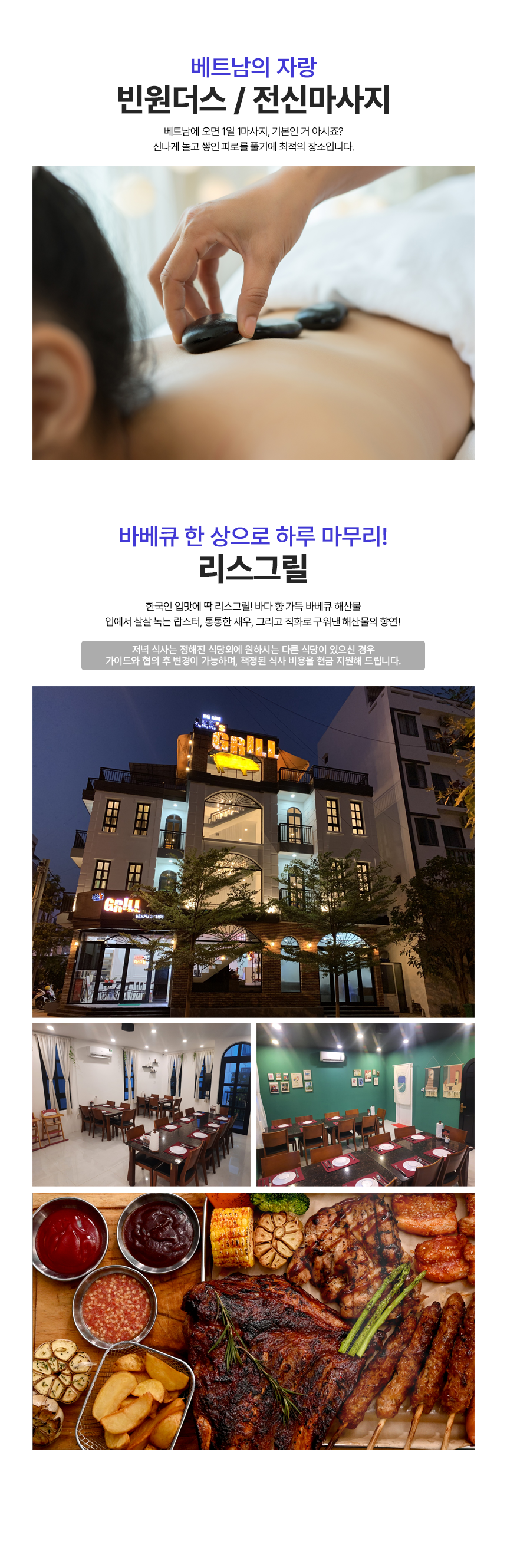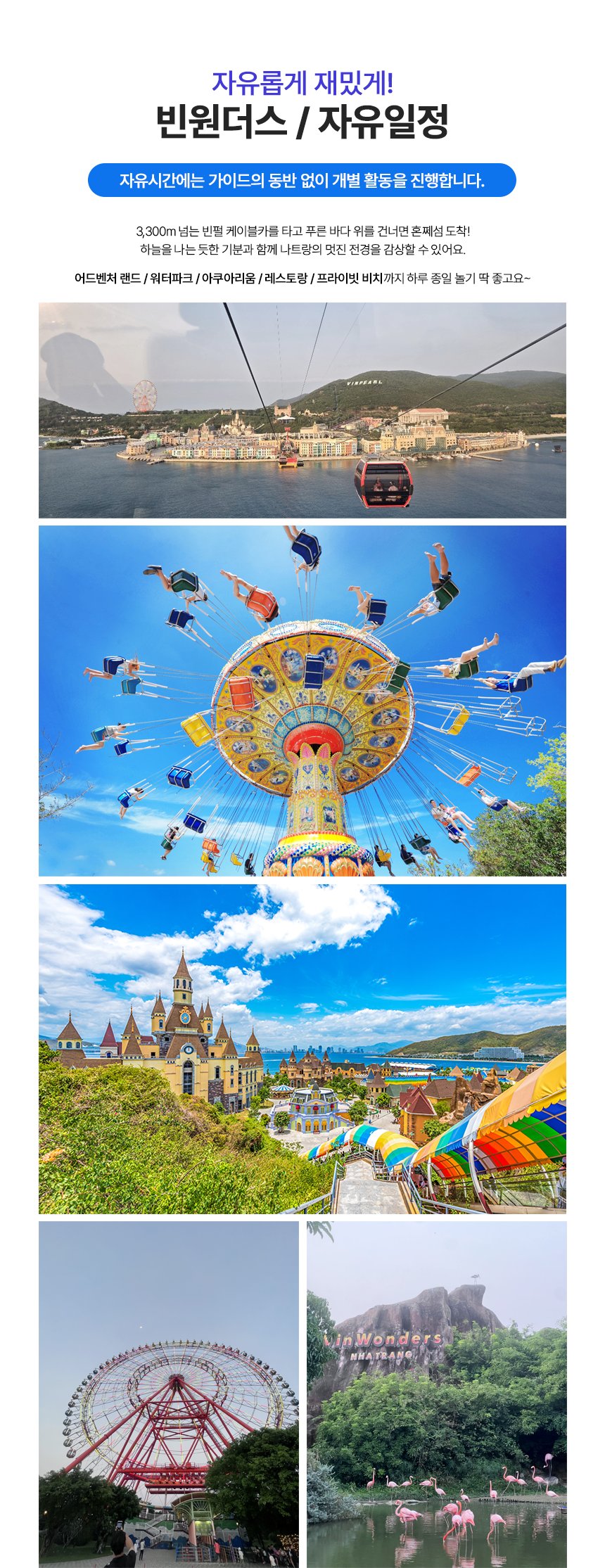 오후 12시 호텔 픽업 → 케이블카 탑승 → 빈원더스 자유시간(테마파크 자유이용) → 점심: 베트남식 반미 → 전신마사지 90분 → 케이블카 탑승 → 저녁: 리스그릴 디너 (현지 인기 스테이크 레스토랑) → 오후20시 호텔복귀
