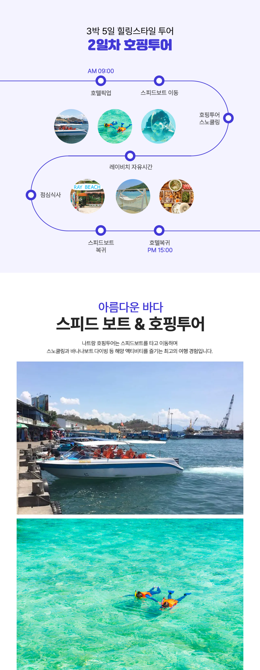 오전 9시 호텔 픽업 → 스피드보트 이동 → 호핑투어 + 스노클링 체험 → 미니비치 자유시간 → 점심: 현지식 특식 → 스피드보트 이동 → 오후 3시 호텔 복귀 & 자유시간