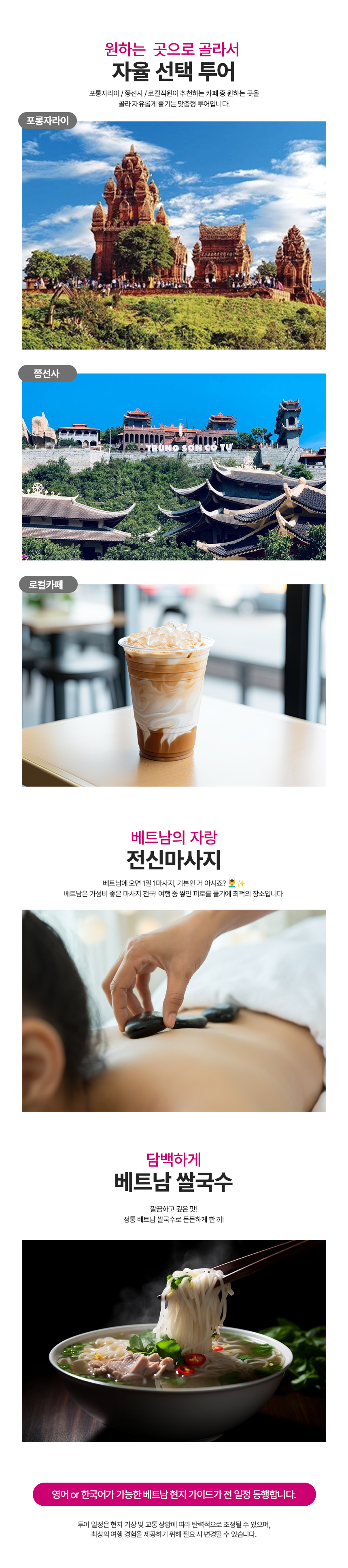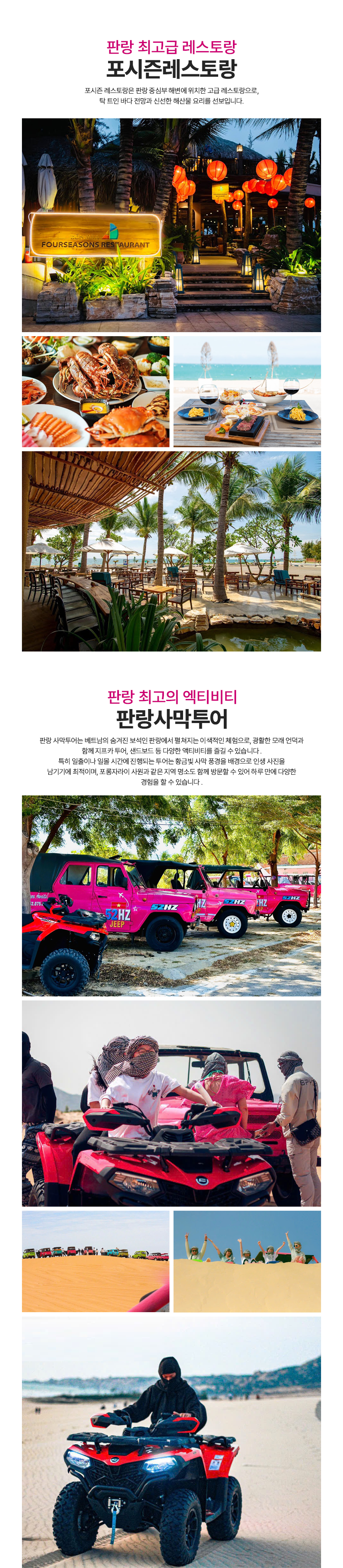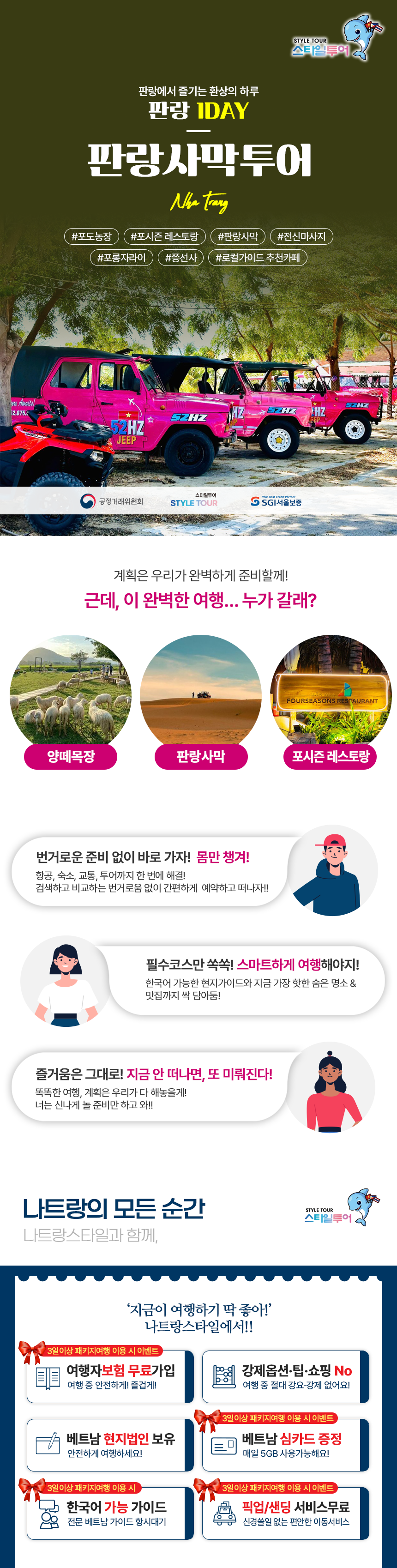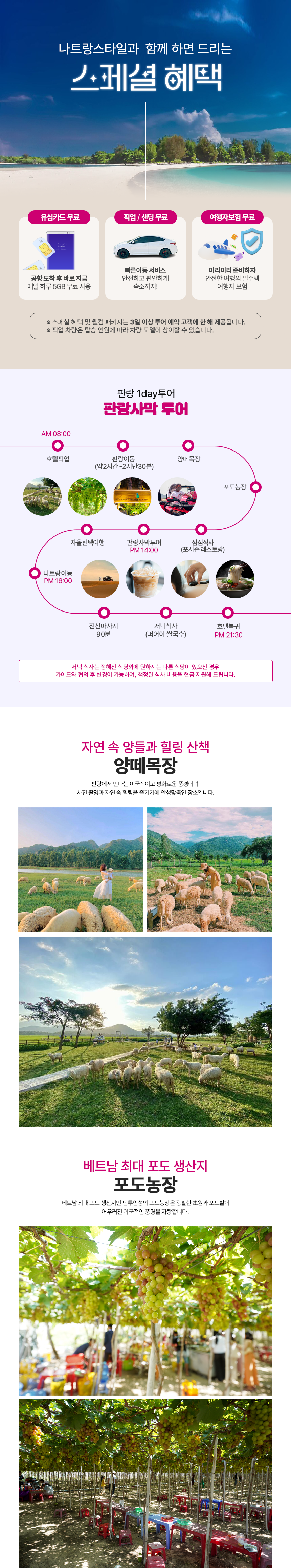 📌 오전 8시 호텔픽업 → 판랑이동(약2시간~2시간30분) → 양떼목장 → 포도농장 → 점심:포시즌레스토랑 → 판랑사막투어 → 자율선택여행 → 나트랑이동 → 전신마사지 90분 → 저녁:퍼어이 쌀국수 → 호텔드랍