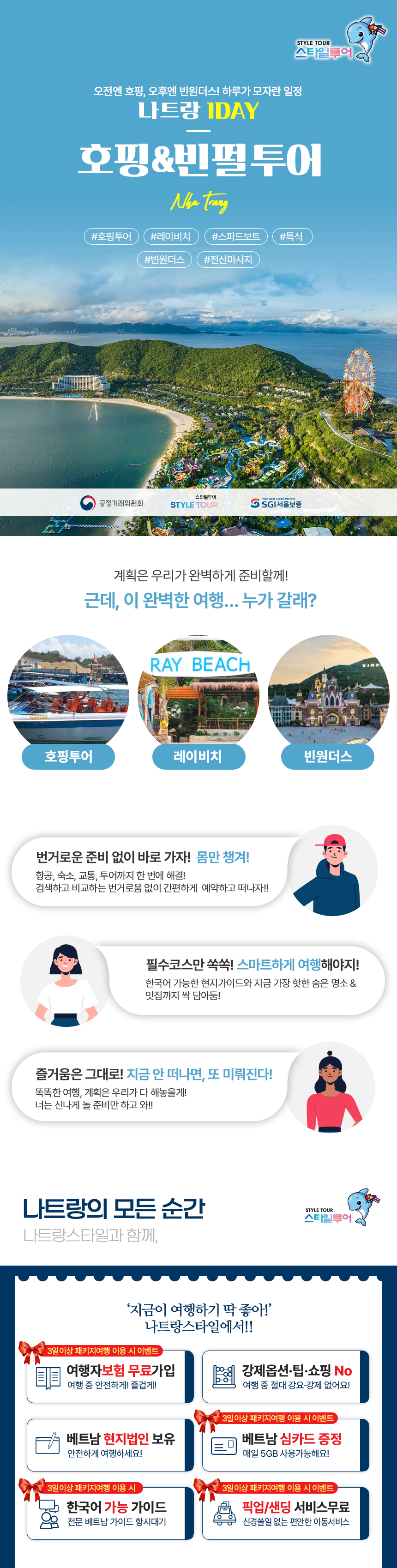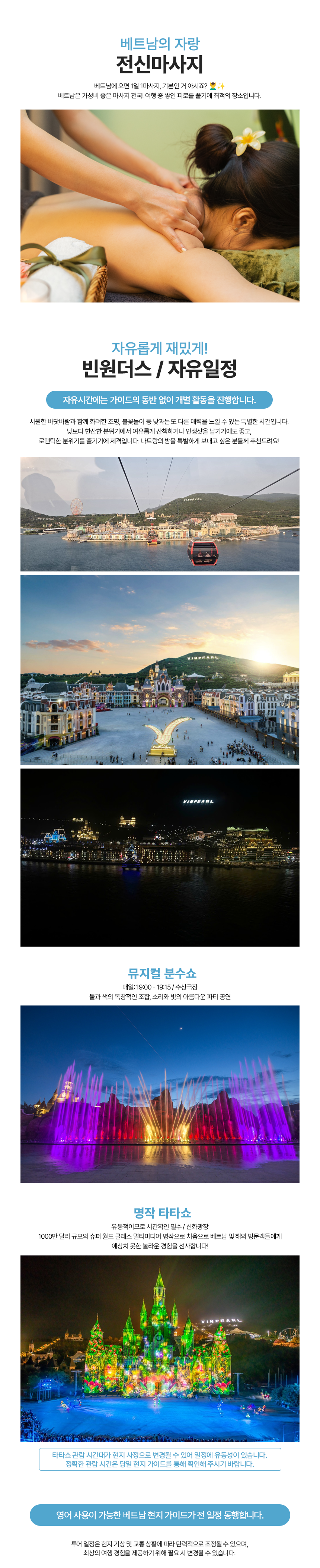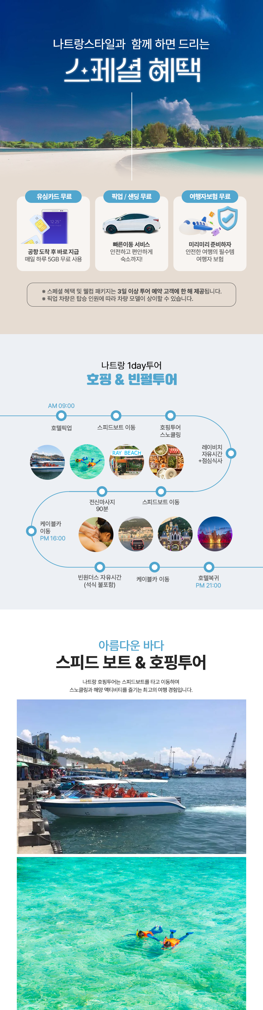 📌 오전 9시 호텔픽업 → 스피드보트 이동 → 호핑투어 스노쿨링 → 레이비치 자유시간+점심(현지식) → 스피드보트 이동 → 전신마사지 90분 → 빈원더스 케이블카 이동(16:00) → 빈원더스 자유시간(석식불포함) → 빈원더스 케이블카 이동 → 호텔드랍