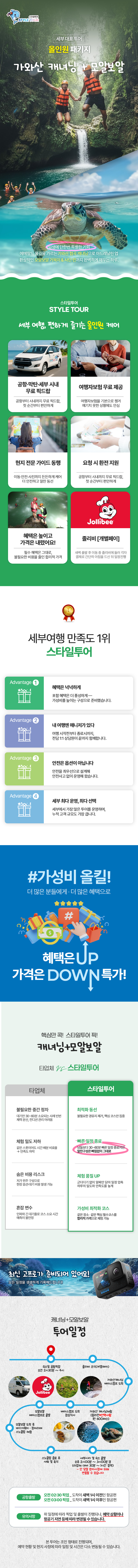 세부 남부의 하이라이트인 가와산 캐녀닝과 모알보알 스노클링을 하루에 즐기는 스타일투어 전용 원데이 패키지입니다.