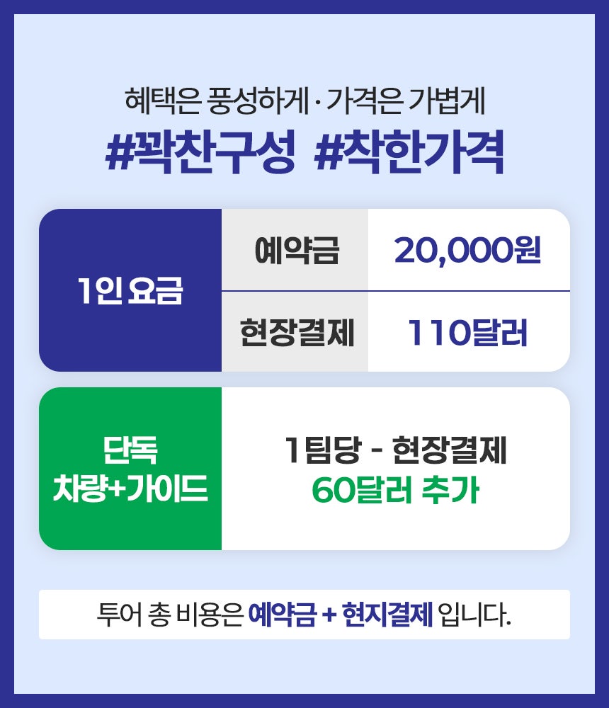 호텔 픽업으로 편하게 이동하고, 이트래블 등록대행까지 한 번에 도와드려 준비 걱정 없이 투어만 즐기시면 됩니다.