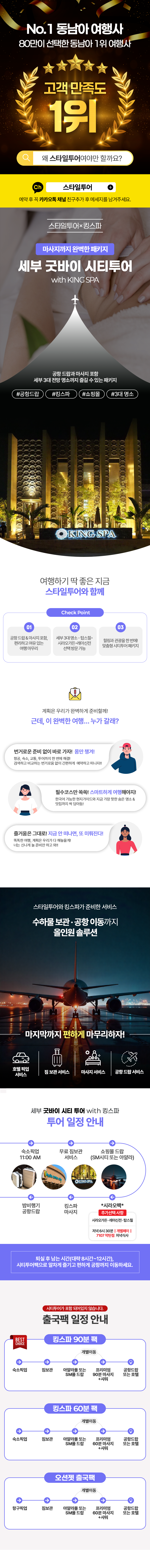 호텔 체크아웃 후 공항 가기 전까지 애매한 시간을 세부 시티투어와 킹스파로 알차게 채우는 마지막 날 전용 패키지입니다.