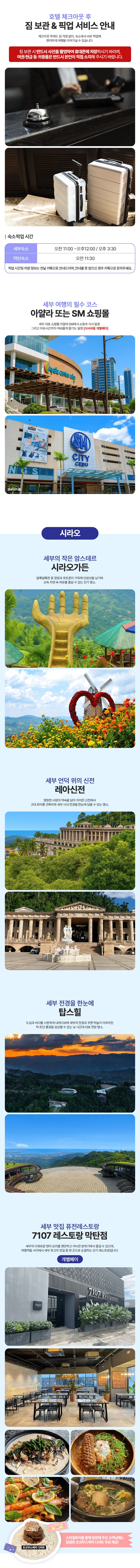 짐 보관 서비스로 손은 가볍게, 아얄라·SM몰 쇼핑과 시라오가든·레이아 사원·탑스 전망 등 대표 스팟을 한 번에 둘러볼 수 있어요.