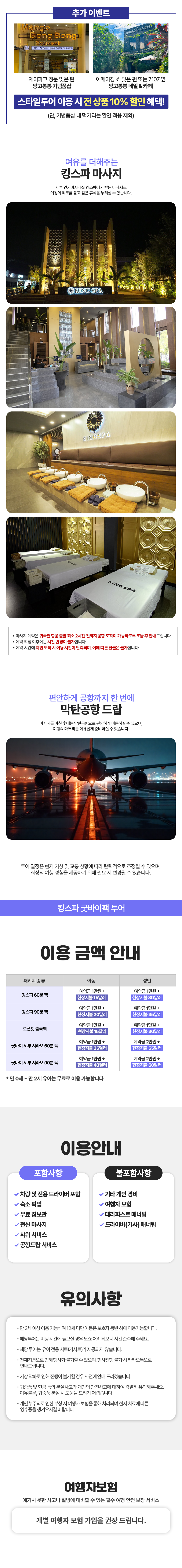 이후 킹스파에서 여유로운 전신 마사지로 여행 피로를 풀고, 전용 차량으로 막탄공항까지 편안하게 이동합니다.