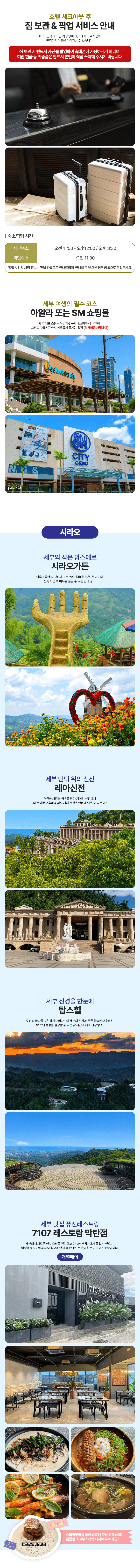 호텔 체크아웃 후 공항 가기 전까지 애매한 시간을 세부 시티투어와 씨엘로스파로 알차게 채우는 마지막 날 전용 패키지입니다.
