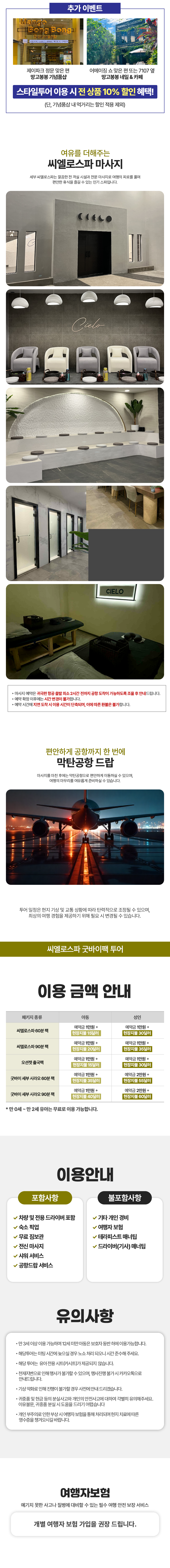 이후 씨엘로스파에서 여유로운 전신 마사지로 여행 피로를 풀고, 전용 차량으로 막탄공항까지 편안하게 이동합니다.