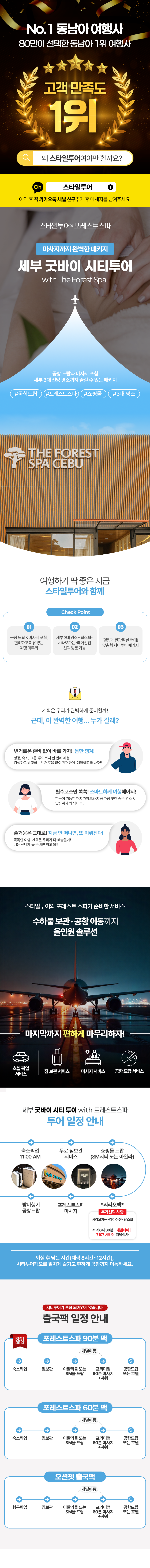 호텔 체크아웃 후 공항 가기 전까지 애매한 시간을 세부 시티투어와 포레스트 스파로 알차게 채우는 마지막 날 전용 패키지입니다.