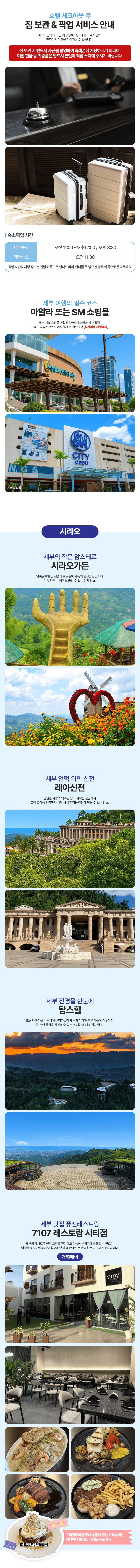 짐 보관 서비스로 손은 가볍게, 아얄라·SM몰 쇼핑과 시라오가든·레이아 사원·탑스 전망 등 대표 스팟을 한 번에 둘러볼 수 있어요.