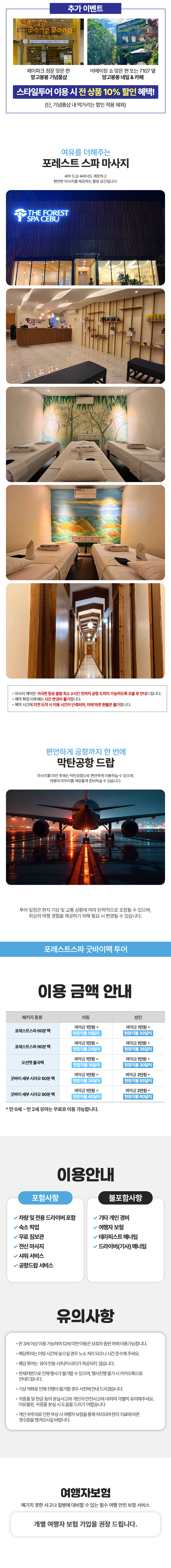 이후 포레스트 스파에서 여유로운 전신 마사지로 여행 피로를 풀고, 전용 차량으로 막탄공항까지 편안하게 이동합니다.